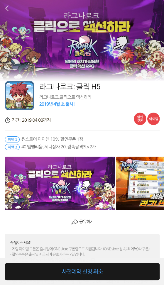 그리고 추가로 사전등록이 실시되고 있는 원스토어에서는 본 게임의 출시 예정일이 4월 초로 되어있는 것을 확인할 수 있는데, 이러한 사전등록의 기간이 4월 8일까지인 것으로 보아 원클릭 쉬운 조작법으로 부담 없는 플레이가 가능한 라그나로크 클릭 H5의 정식 출시일은 4월 9일인 화요일로 예상됩니다.