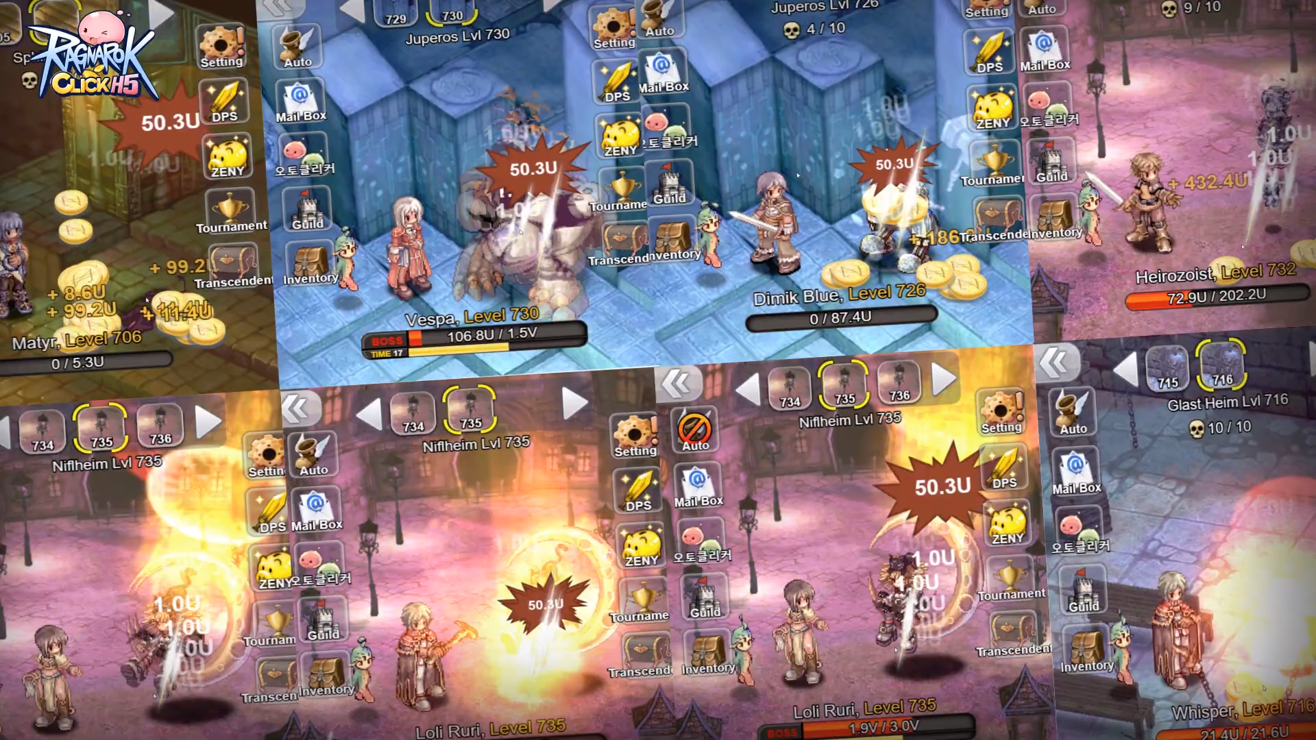 기본적으로 라그나로크 클릭 H5는 수집한 모험가(영웅)들을 구성하여 화면을 클릭 또는 탭하면서 스테이지에서 등장하는 몬스터들과 싸우는 방식으로, 화면을 클릭하여 공격하고 몬스터 카운트를 채워 다음 스테이지로 이동해나가면서 전투에서 얻은 제니를 소모하여 모험가의 레벨업과 스킬 개방을 통해 육성이 가능하다는데, 얼핏 보면 게임 시스템이 방치형 RPG 장르 하고 매우 유사해 보입니다.