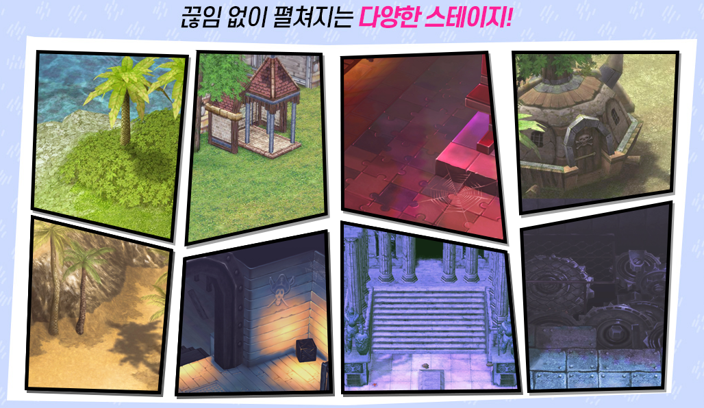 또한 게임에서 스테이지를 돌면서 라그나로크의 세계관 감성이 그대로 재현되어 있는 추억의 맵들을 만날 수 있는데, 이를 통해 끊임 없이 펼쳐지는 다양한 스테이지 속에서 클릭하는 재미와 함께 짜릿하게 터지는 무한 쾌감을 느낄 수 있다고 합니다.