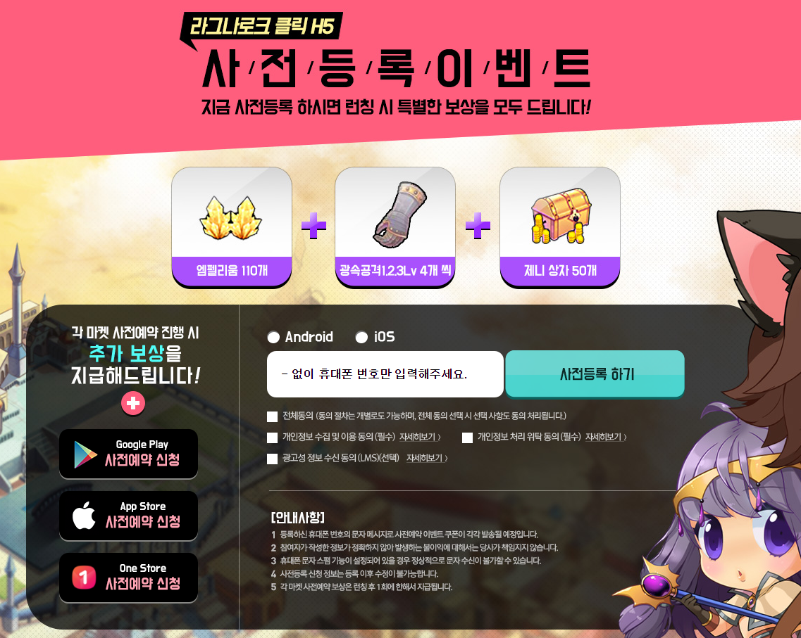 남녀노소 누구나 쉽고 부담 없이 즐길 수 있도록 개발된 라그나로크 클릭 H5의 사전등록은 현재 브랜드 페이지와 더불어 구글 플레이와 앱스토어 그리고 원스토어를 통해서 참여가 가능하며, 각 마켓을 통해서 진행되는 사전등록에 신청하시면 참여자 분들에 한해서 론칭 시 엠펠리움과 제니상자 같은 특별한 보상의 혜택들을 제공받을 수 있다고 합니다.