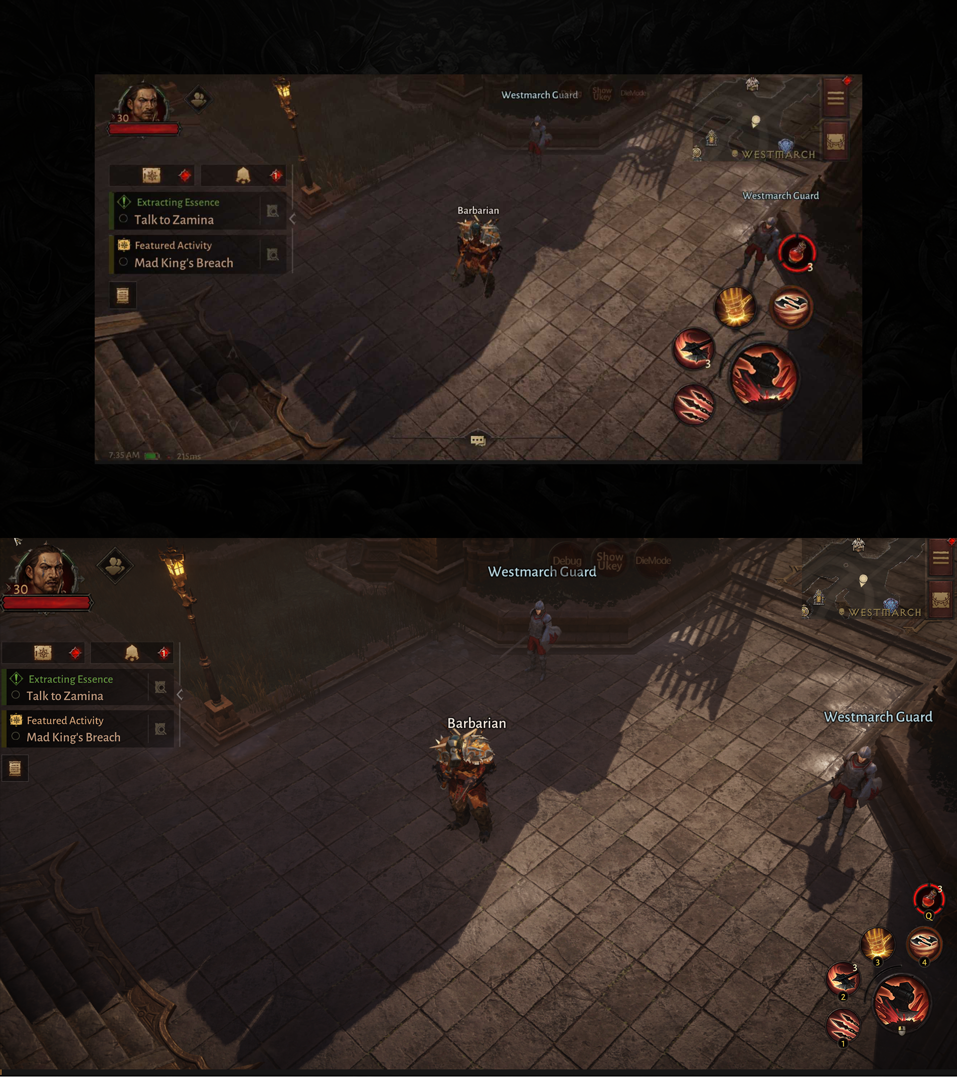 원래 계획은 모바일 용이었던 디아블로 이모탈은 UI가 모바일 기기의 화면에 맞춰 확대된 화면이었지만 PC에서 불편함 없도록 각종 UI들의 크기를 축소화해 PC 환경에 적합하도록 HUD를 조정하였다고 하네요.