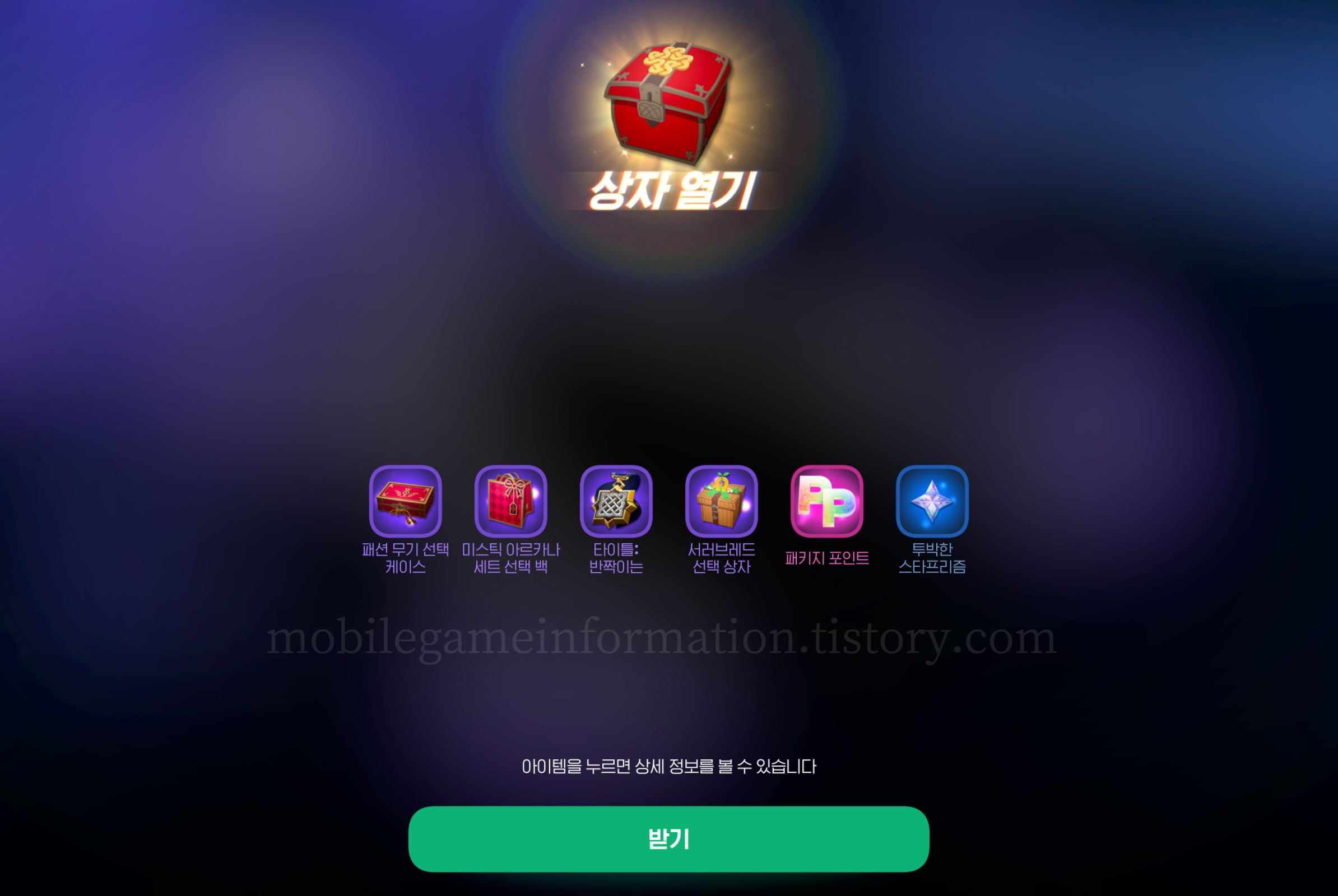 개봉 시 아래 아이템들을 획득할 수 있음.
